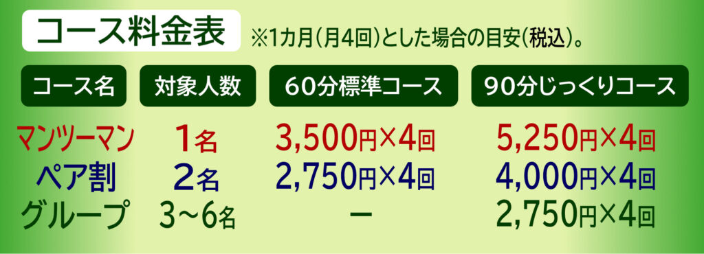 体験レッスン料金:今なら無料!(体験レッスン無料キャンペーン中!)